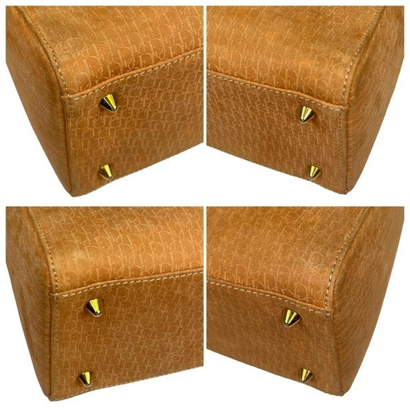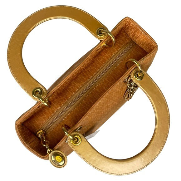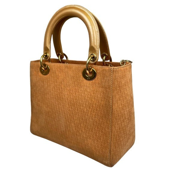 Christian Dior Lady Monogram Suede Tan Golden Handle Enamel Leather Top Handle