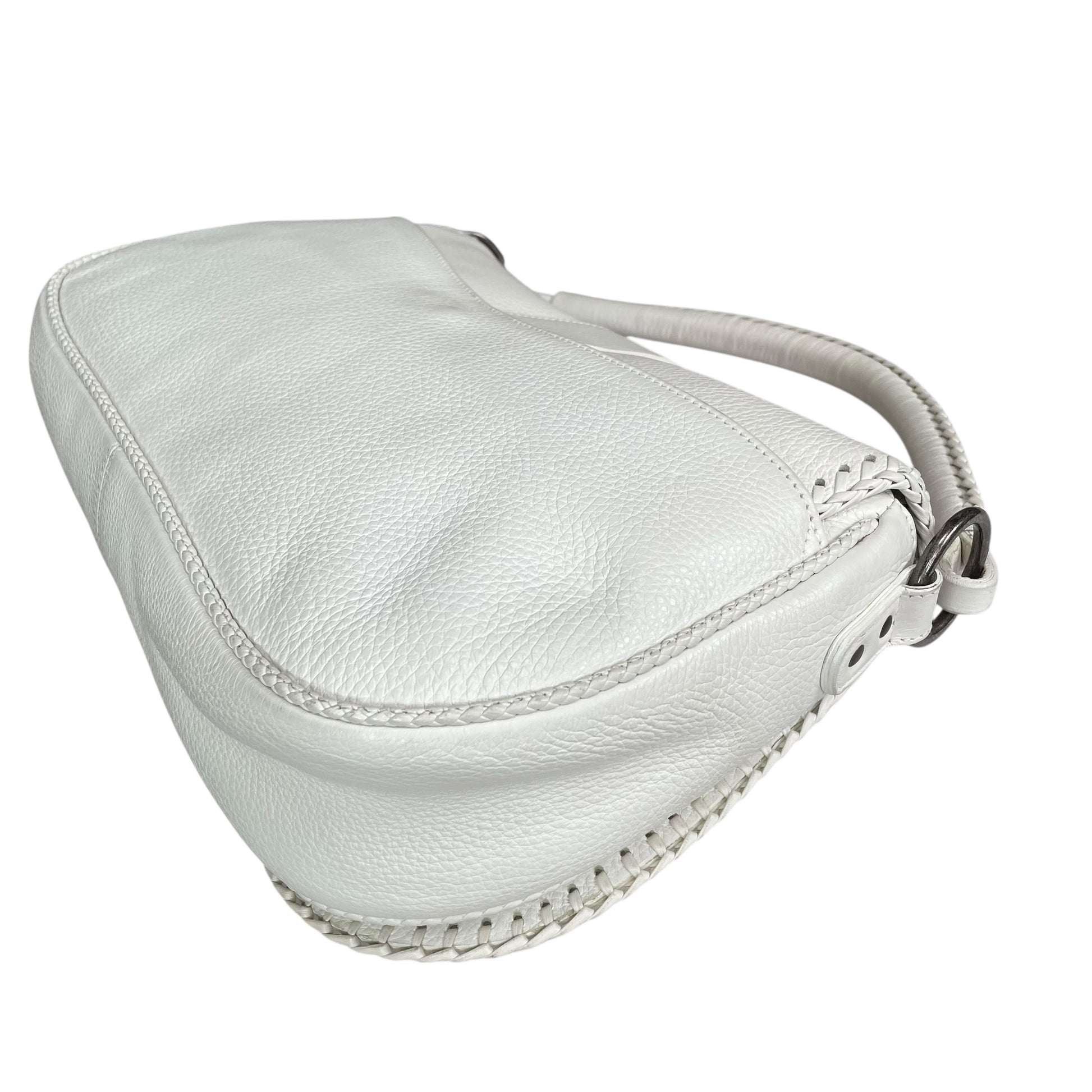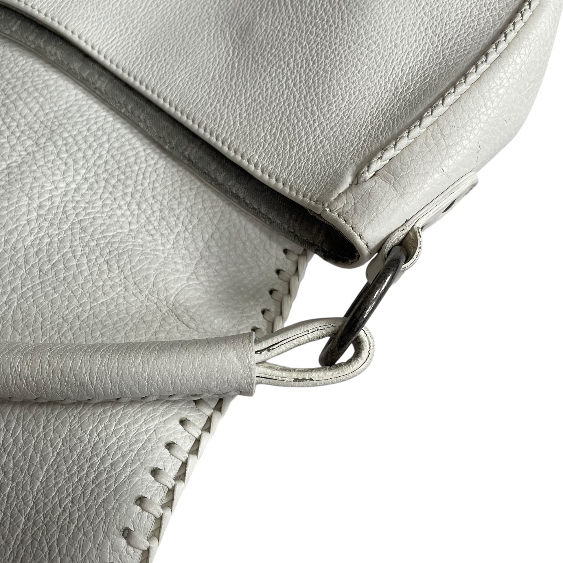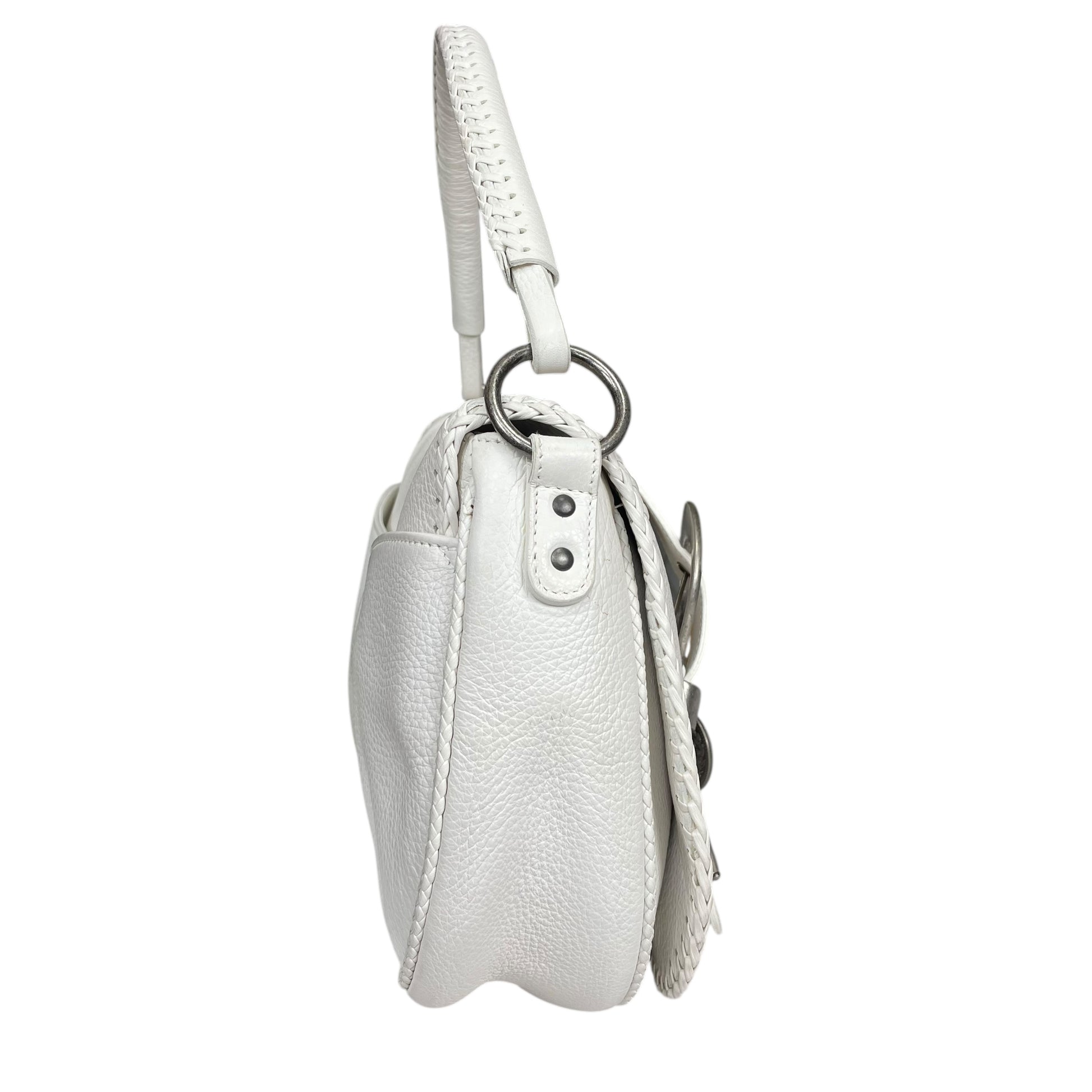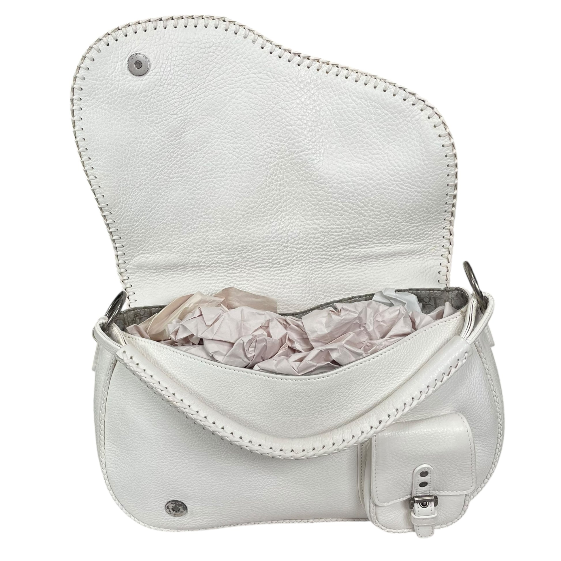 This rare Christian Dior gauchoWhipstitch Shoulder Bag from the early-2000s Galliano era has been fully restored, professionally conditioned, and authenticated — a standout vintage Dior piece in winter white leather with signature whipstitch edging and heavy silver-tone hardware. Clean, structured, and beautifully maintained, this is one of the most collectible Dior silhouettes from the Y2K period.