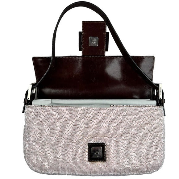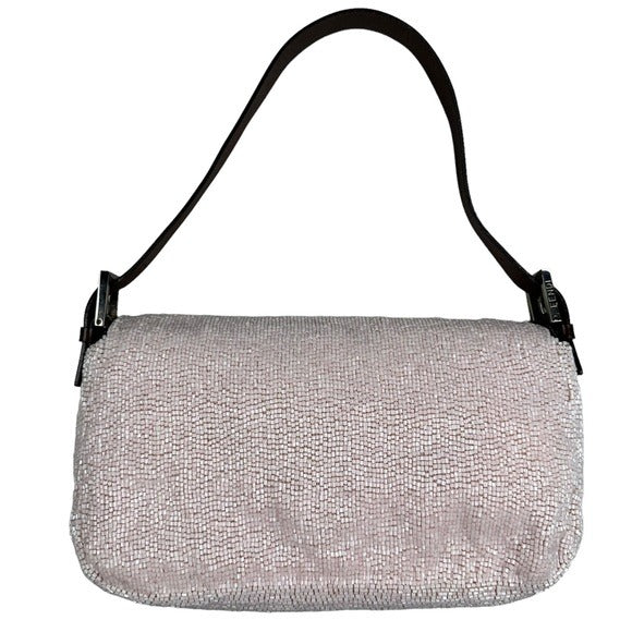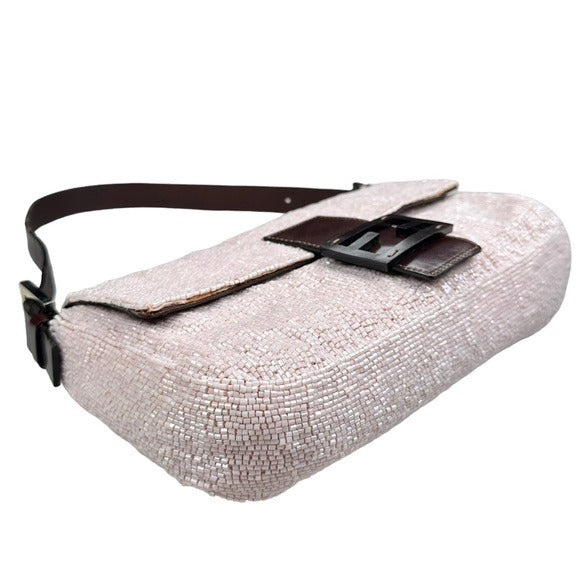 Fendi Baguette Pink Beaded Flap Silver Brown Leather Shoulder Purse