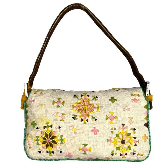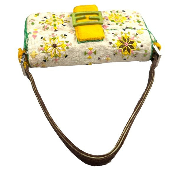 Fendi Mustard Pastel Cavnas Beaded Cow Brown Pony Hair Baguette Shoulder Purse