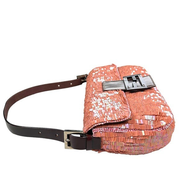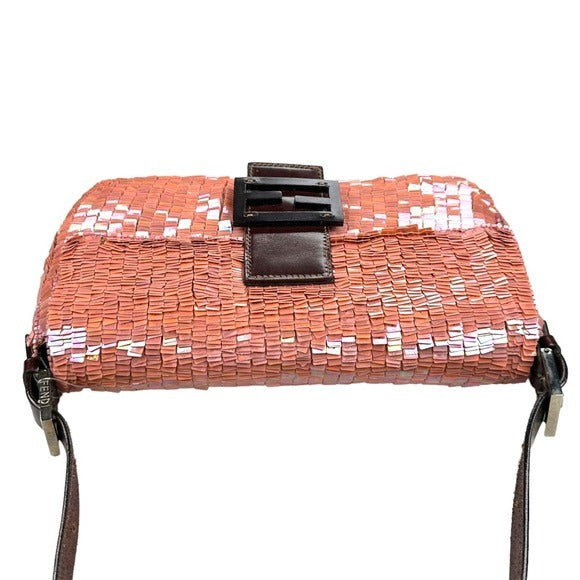 Fendi Pink Coral Iridescent Sequin Baguette Flap Brown Leather Shoulder Bag