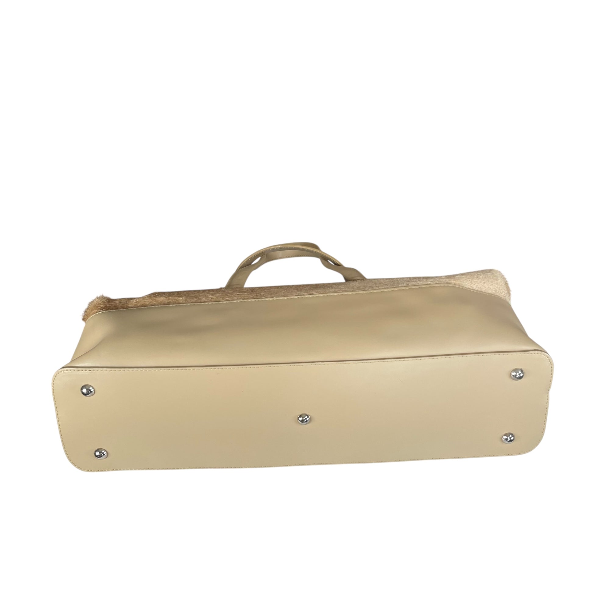The warm tan pony hair exterior gives the bag a sophisticated vintage look while the leather base and handles provide durability and structure. The bag stands upright and holds its shape beautifully.