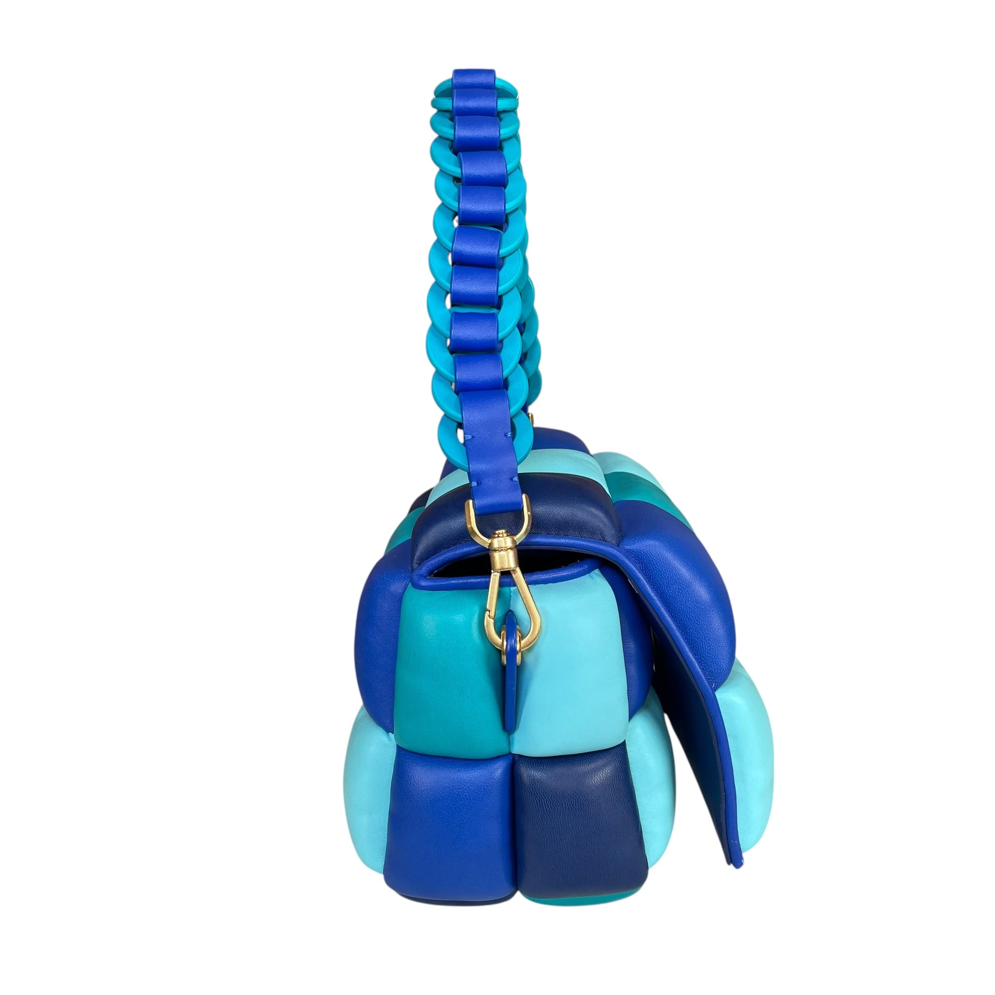 A bold and highly stylized design from Kate Spade, this Boxxy bag features a sculptural 3D puffer construction in a striking mix of blue tones. The padded leather panels create a dimensional, almost architectural look that immediately stands out.