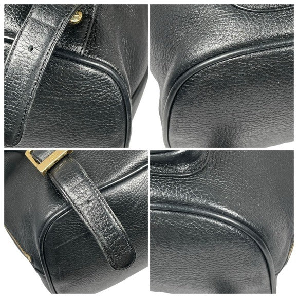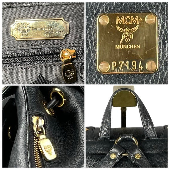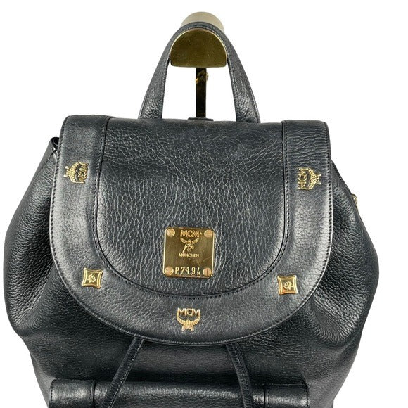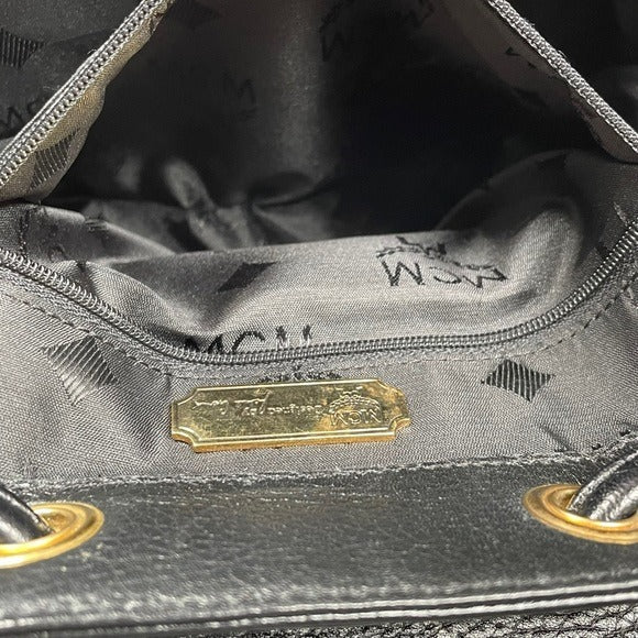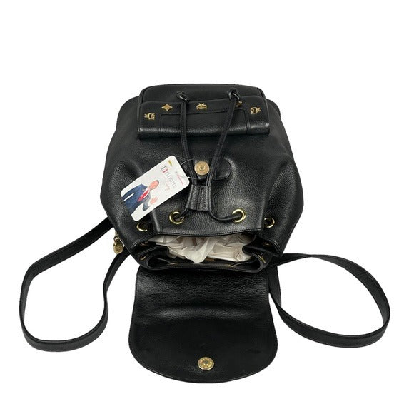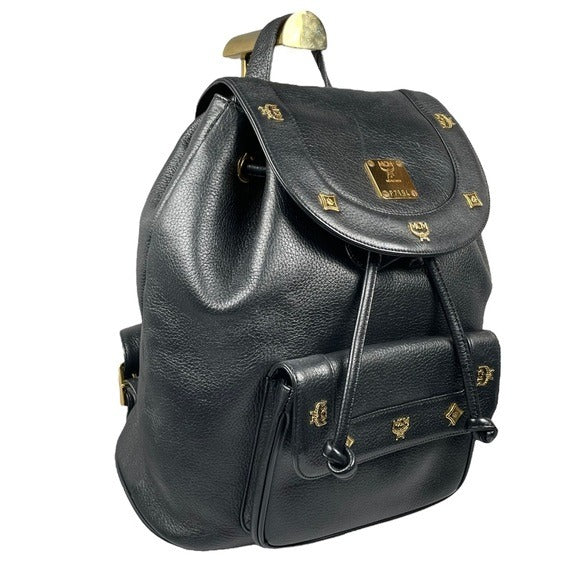 MCM Black Calf Leather Pebbled Gold Plated Multi Stud Flap Drawstring Backpack