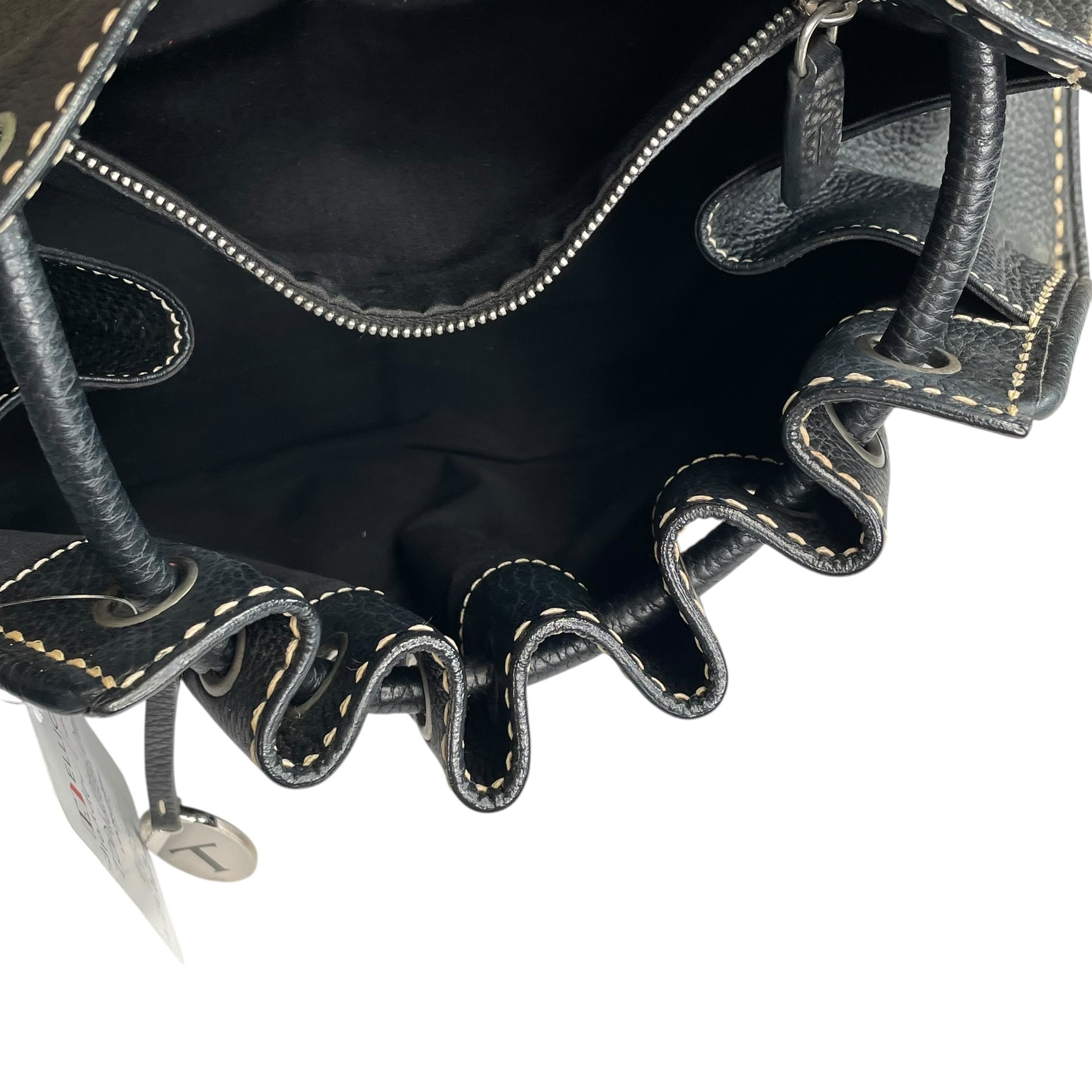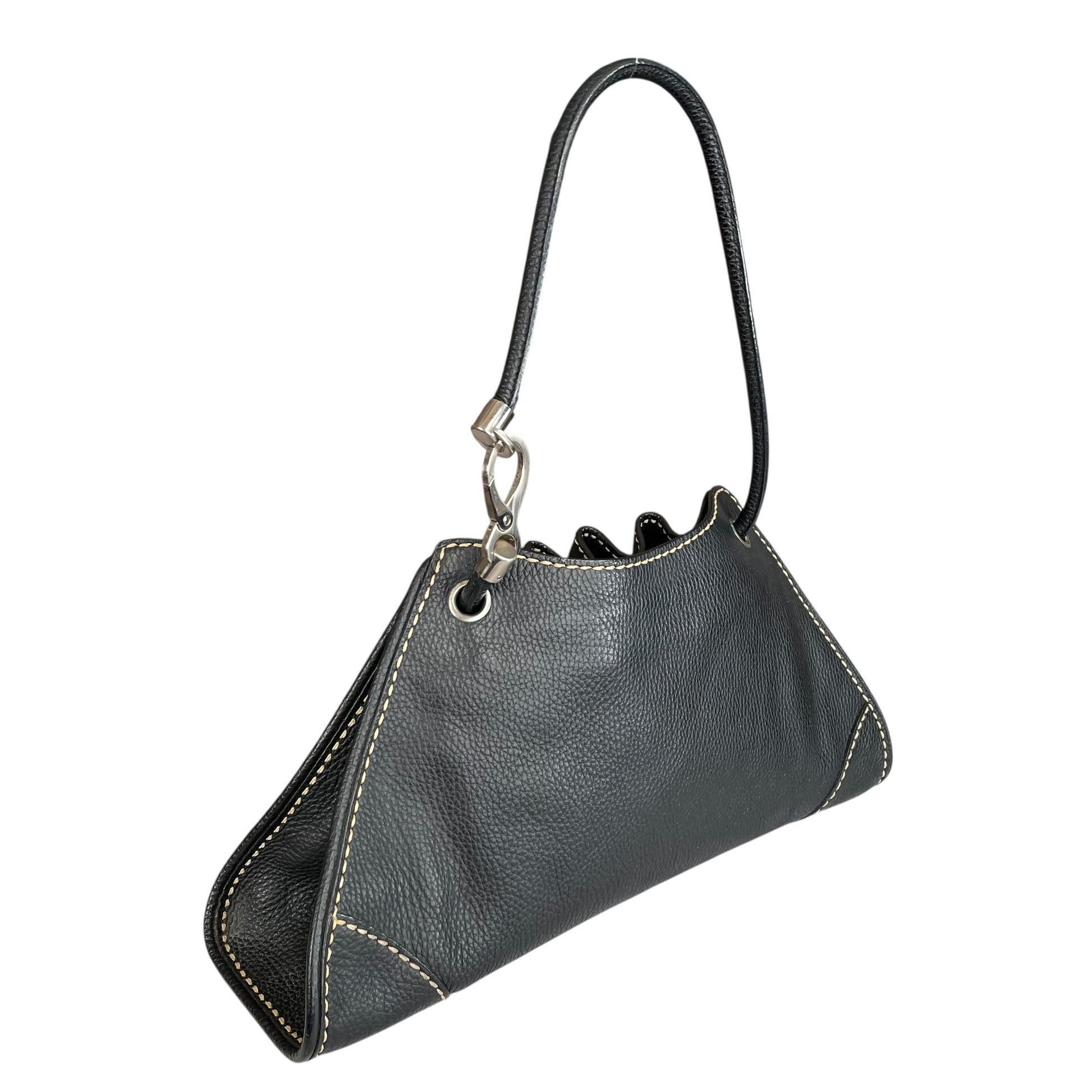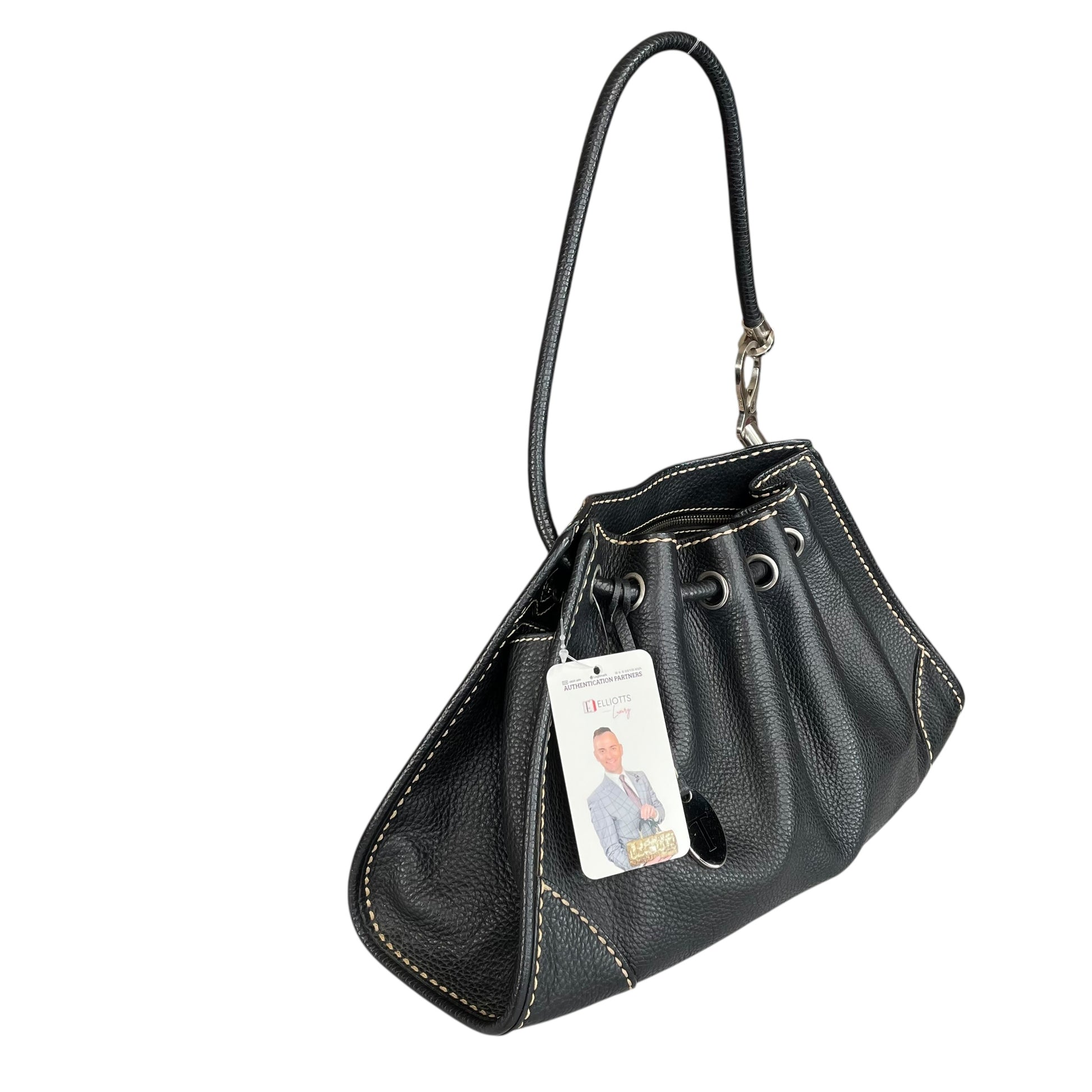 This bag falls into the drawstring hobo / bucket bag category commonly produced by Tod’s. It has the relaxed shape and soft leather construction that made many of their early-2000s bags highly sought after in the resale market.