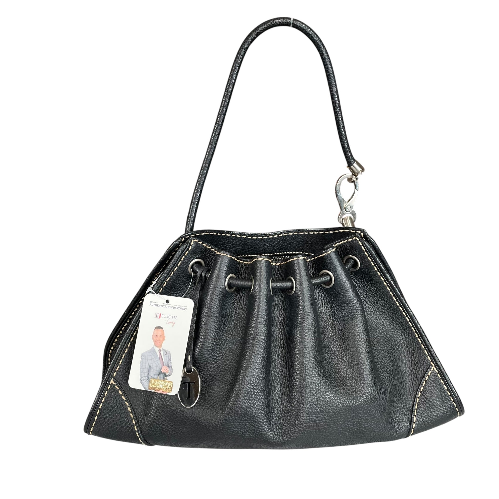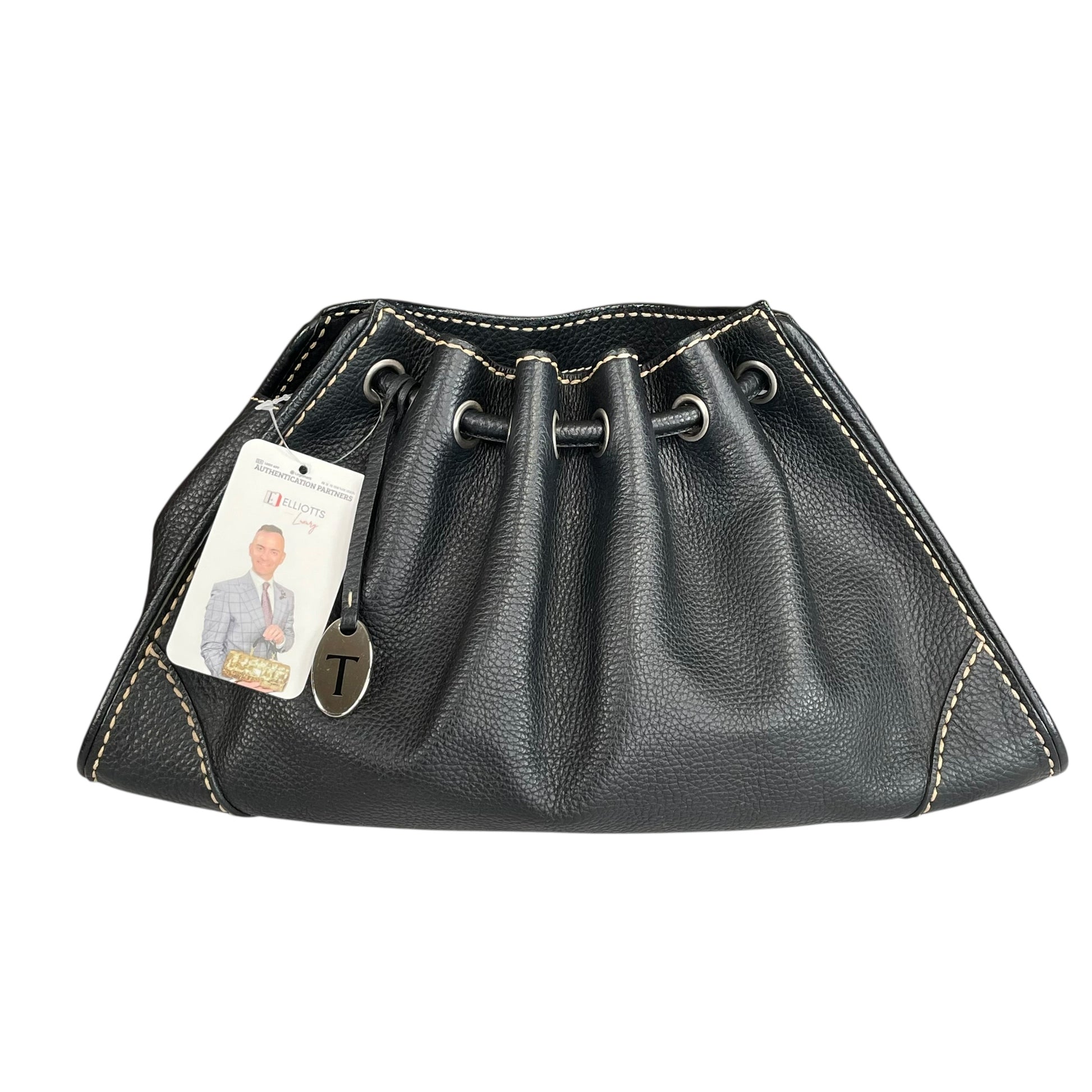 This Tod’s black leather drawstring shoulder bag is a sophisticated Italian-made piece crafted from soft pebbled calf leather with striking contrast stitching and brushed nickel hardware.