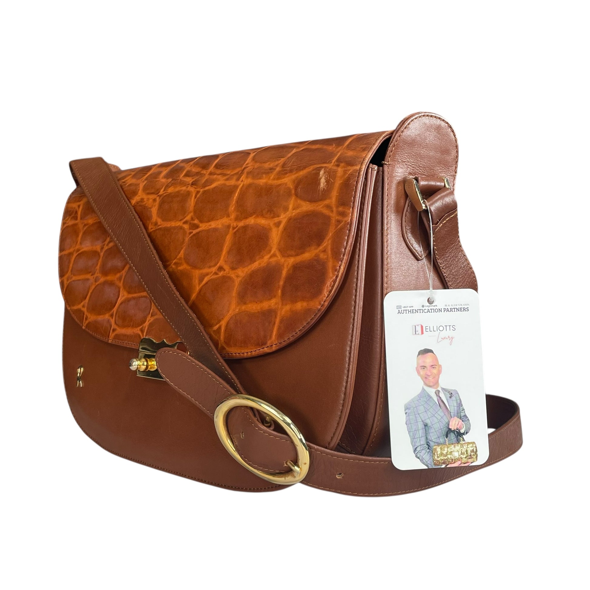The bag features a rich brown leather body with a crocodile-embossed leather flap, creating an elegant contrast in texture. The structured silhouette is complemented by polished gold-tone hardware, including a unique turn-lock style clasp and an oversized circular buckle on the adjustable shoulder strap.
