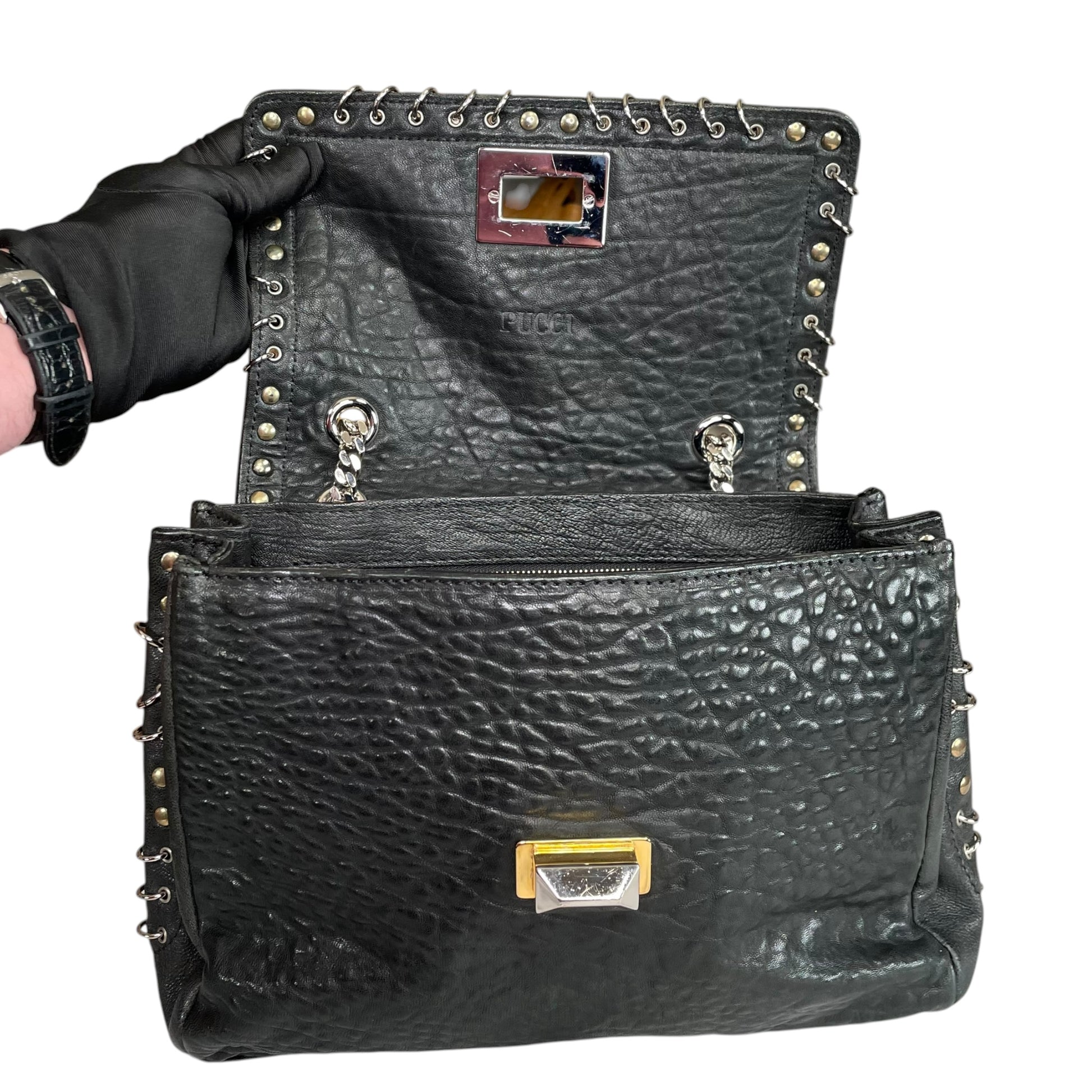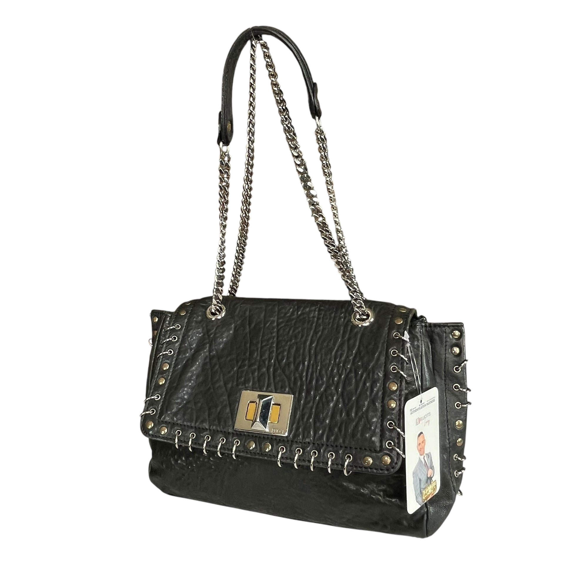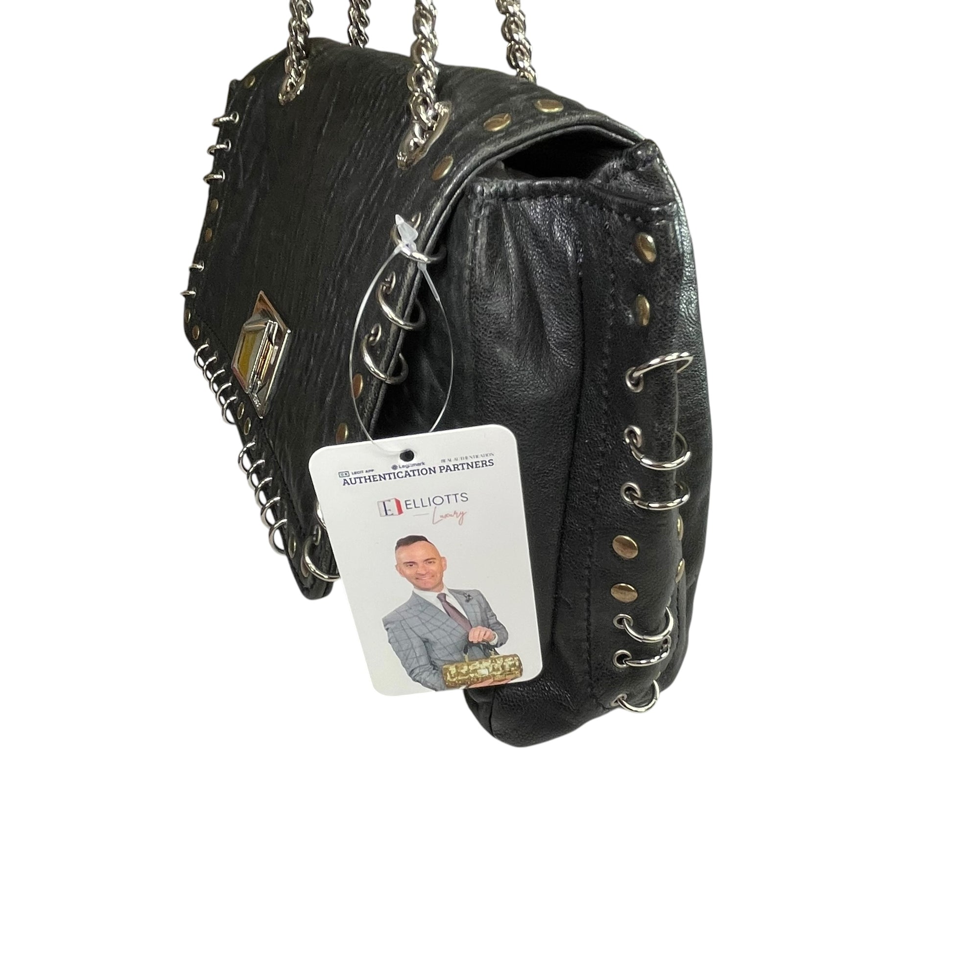 Emilio Pucci Pierced Studded Flap Black Aged Cowhide Silver Gold 2-Way Shoulder Bag